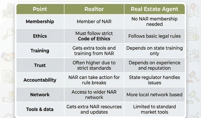 A realtor vs an estate agent mainly differ in professional standards and ethical rules. A realtor chooses to follow higher rules. They join the National Association of Realtors. They work under a strict Code of Ethics at all times. On the other hand, a real estate agent only needs a license to start working. They follow basic legal rules, but not the same extra code. Because of this, both can do similar work. However, the level of trust and responsibility is not the same.