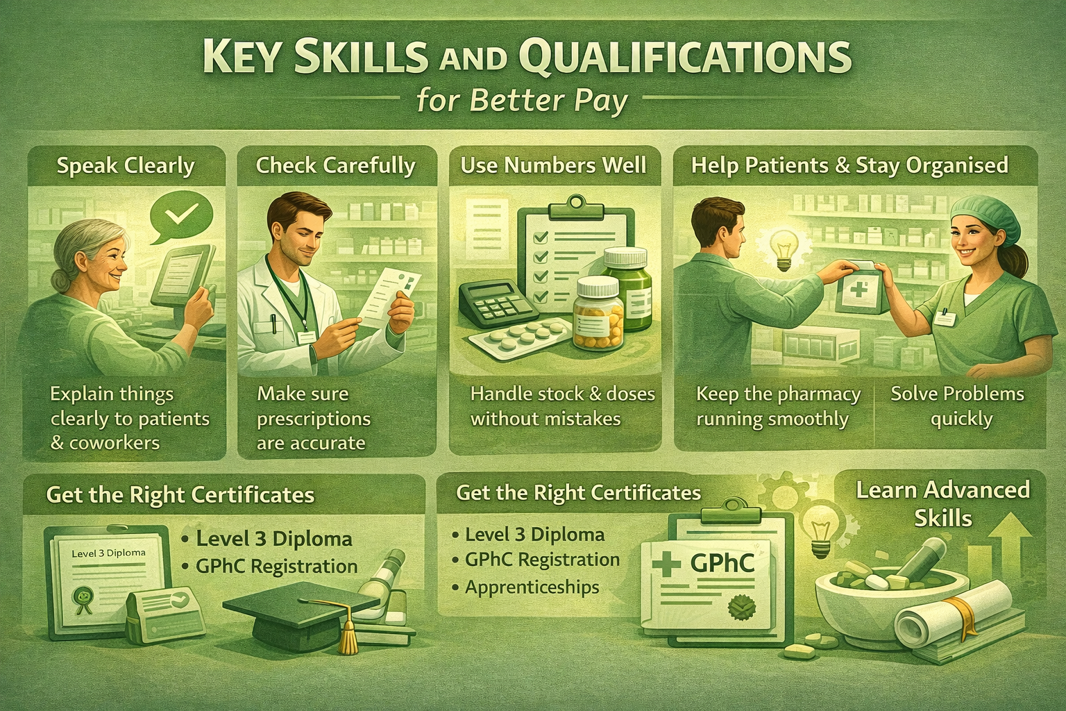 • Qualifications help: Getting GPhC registration, a Level 3 Diploma or extra training can boost your salary.