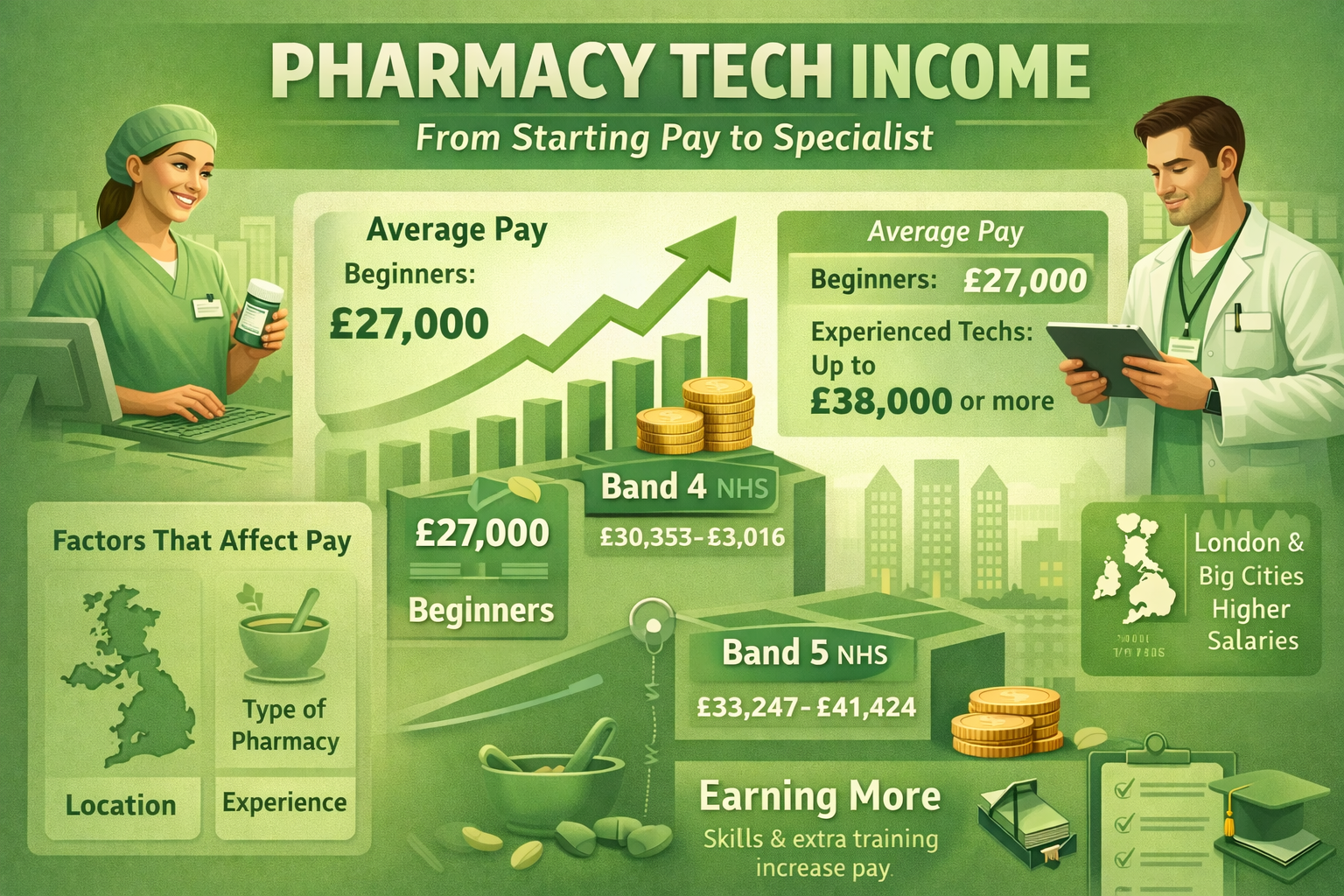 Starting pay is the first step in your journey as a pharmacy technician. For most beginners, this means joining the NHS at Band 4 or starting out in a community pharmacy. In the NHS, Band 4 salaries range from £30,353 to £33,016 per year. Community pharmacies usually offer between £27,000 and £30,000. In London, starting pay can be slightly higher, around £28,152 to £30,000. Trainees who are still learning may earn the National Minimum or Living Wage until they are fully qualified.