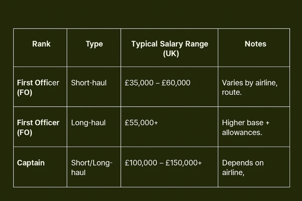 - Short-Haul First Officer (A320/B737): Around £35,000–£60,000 per year.