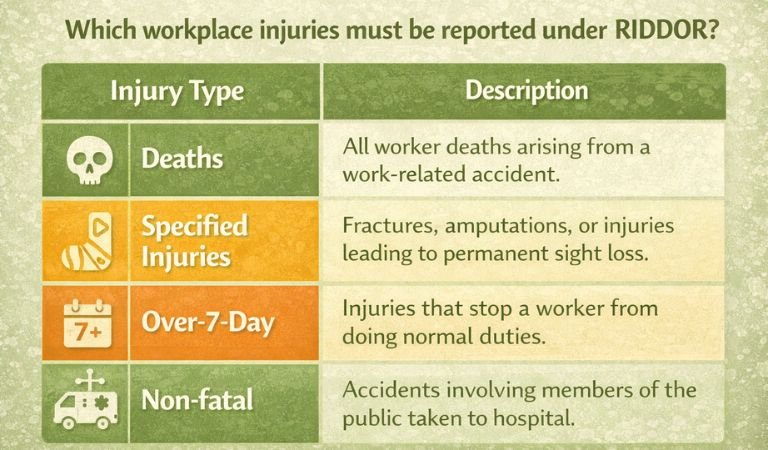 - Deaths, specified injuries, over-7-day injuries, dangerous occurrences, and certain work-related diseases must be reported under Reporting of Injuries, Diseases and Dangerous Occurrences Regulations 2013.