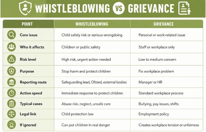 Whistleblowing always links to child safety or serious risk. It focuses on harm, danger or illegal actions. But a grievance is fully different. It stays around personal or work problems, not child safety.